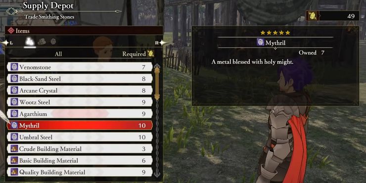 El método más sencillo de adquirir Mythril en Fire Emblem Warriors: Tres esperanzas está visitando al maestro de suministros en el campamento de guerra. Este comerciante NPC tendrá una opción llamada “Comerciar piedras de herrería”, que le permite al protagonista intercambiar piedras de herrería por una variedad de artículos y materiales valiosos. Uno de estos materiales es Mythril, que se puede comprar por Smithing Stones ×10.