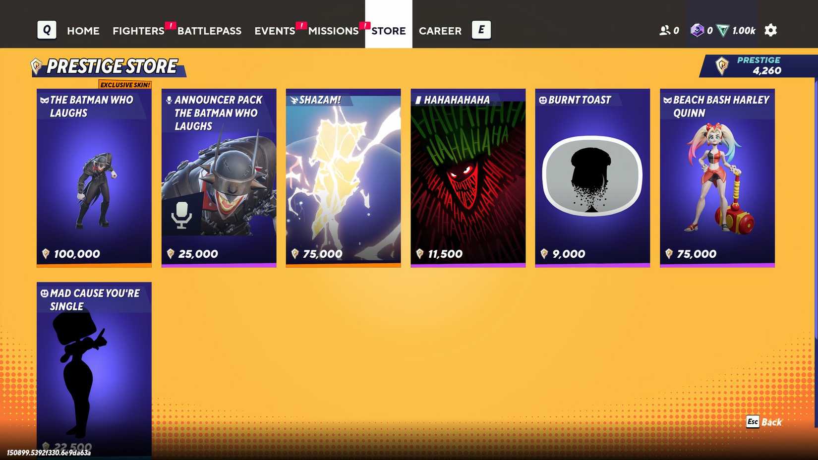 Los puntos de prestigio son una moneda en MultiVersus solía hacerlo Desbloquea artículos cosméticos exclusivos o luchadores en Prestige Store.. La Tienda de Prestigio es parte de la pestaña de tienda ubicada en el menú principal del juego. Si te desplazas hacia abajo, podrás encontrar las tiendas Prestige y Fighter ubicadas cerca de la parte inferior de la pantalla. La tienda de luchadores es donde puedes comprar nuevos luchadores, como The Joker, para agregarlos a tu lista. Puedes comprar luchadores con Prestige o Gleamium.