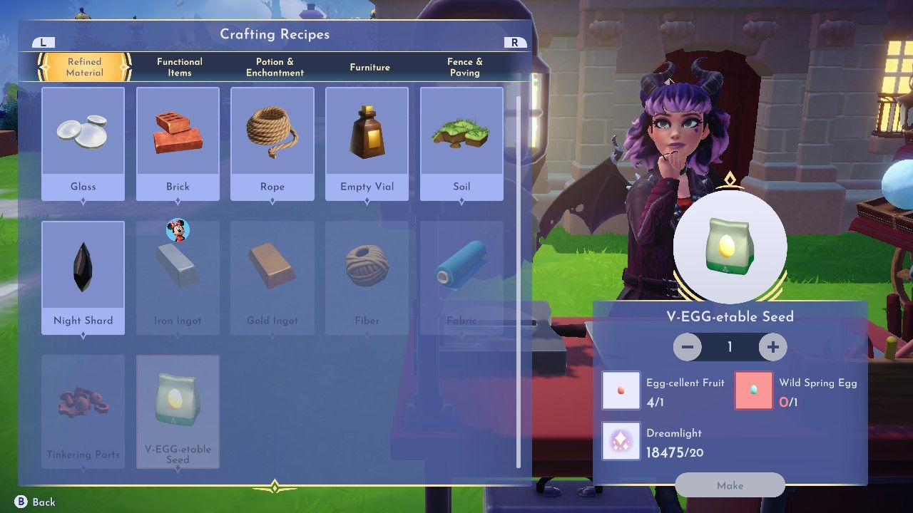 Una vez que se hayan recolectado ambos, los jugadores deberán dirigirse a una estación de elaboración para crear las semillas V-EGG-etable. La receta para elaborarlos es 1x Egg-Cellent Fruit, 1x Wild Spring Egg y 20x Dreamlight. Si necesita más Dreamlight, intente hacer algunas tareas diarias para ganar más, o regrese a la estación de fabricación y use Dream Shards para crear algunos. Una vez elaboradas, las semillas están listas para ser cultivadas y cosechadas. No importa el bioma donde se planten, no crecerán más rápido en un bioma específico.