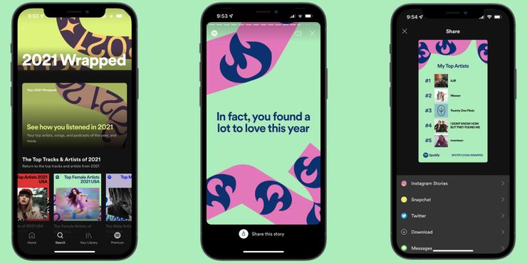 Si eso suena como demasiado trabajo, otra opción es mirar / saltar hasta el final de Wrapped 2021. La última página muestra una descripción general de alto nivel de todo lo que escuchaste durante todo el año, incluido tu álbum favorito, los cinco mejores artistas, los cinco mejores. canciones, género número uno y cuántos minutos escuchaste durante el año. Puede deslizar horizontalmente sobre estos para ver la misma información con diferentes colores / temas. Después de encontrar el perfecto, toque ‘Compartir’, elija cómo desea compartirlo y listo.