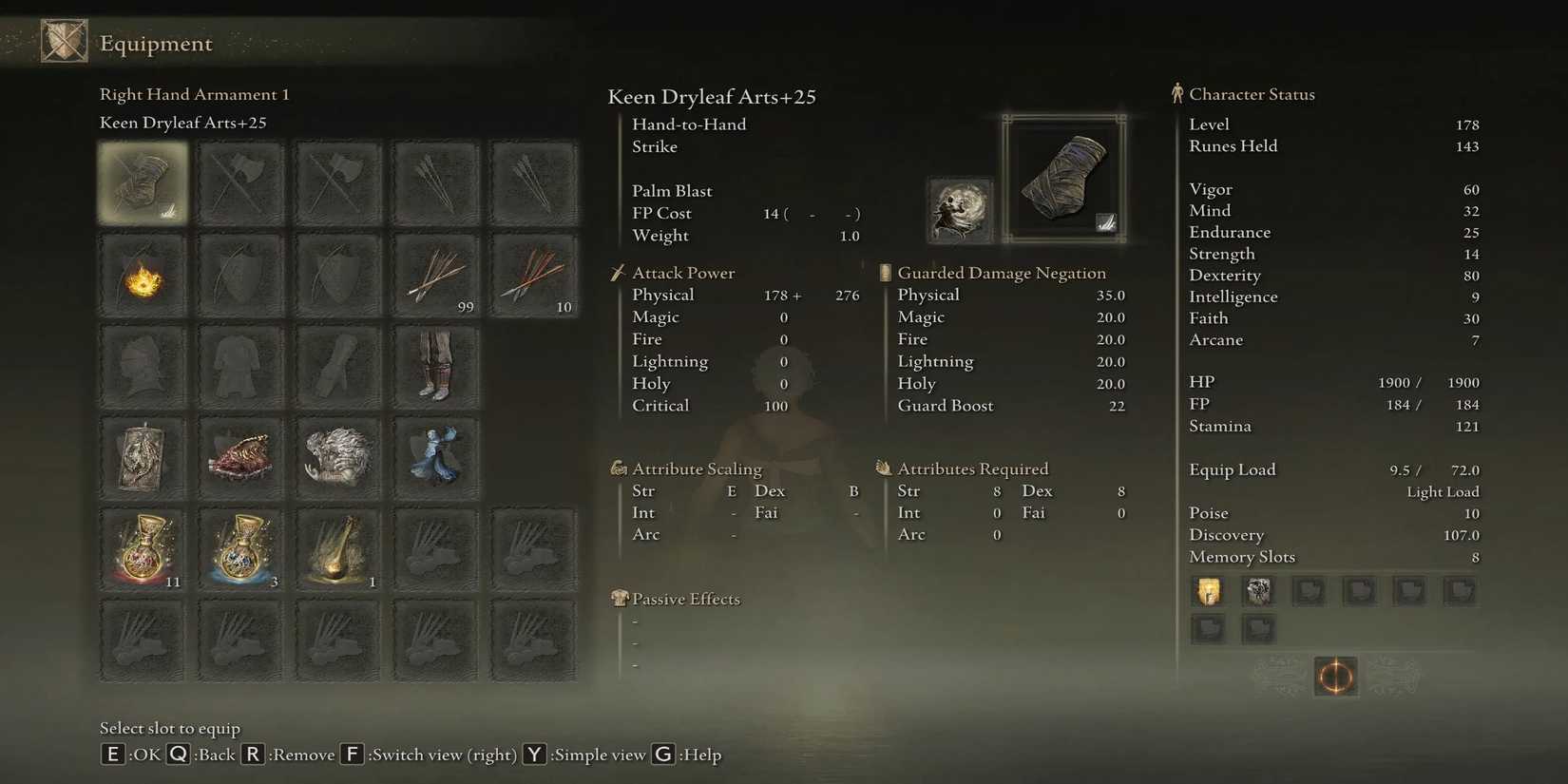 Lo maravilloso de estas armas es que se pueden usar con la mano izquierda, ya que de todos modos querrás cambiar a su conjunto de movimientos a dos manos, por lo que se pueden incluir en cualquier configuración. Como tal, la infusión de tus Artes de la hoja seca dependerá completamente de la configuración actual que estés usando. Por ejemplo, una infusión de Arte de la llama agregará daño de fuego y escala de fe, mientras que una infusión de magia agregará daño de magia y escala de inteligencia. Se recomienda aumentar el daño base de las Artes de la hoja seca, ya que La mayor parte del daño de esta arma provendrá de Palm Blast..