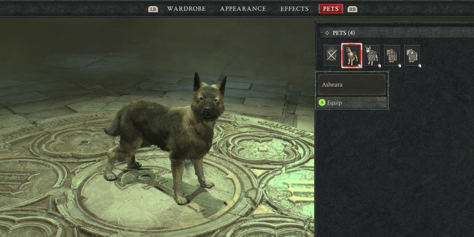 En tu guardarropa, se agregó una pestaña para Mascotas, y cualquiera que hayas desbloqueado se mostrará para que puedas equiparla. Actualmente, el Perro Asheara es la única mascota que se puede desbloquear mientras se juega, pero Se pueden agregar tres más reservando DLC. Hratli el canino, Natalya el tigre y Alkor el leopardo de las nieves aparecen en la pestaña Mascotas del guardarropa, pero no se pueden seleccionar.