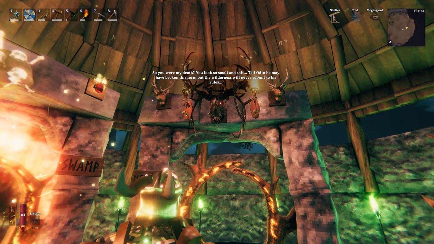 Las antorchas, los soportes para objetos y los apliques también son indicadores visuales importantes que ayudan a distinguir los portales entre sí. Armas como hachas, herramientas como cañas de pescar y picos, y muchos más objetos, también podrían indicar el propósito de un teletransportador mejor que cualquier nombre. Los letreros también pueden comunicar el nombre exacto de un Portal en Valheim antes de comprobarlo con tu personaje.