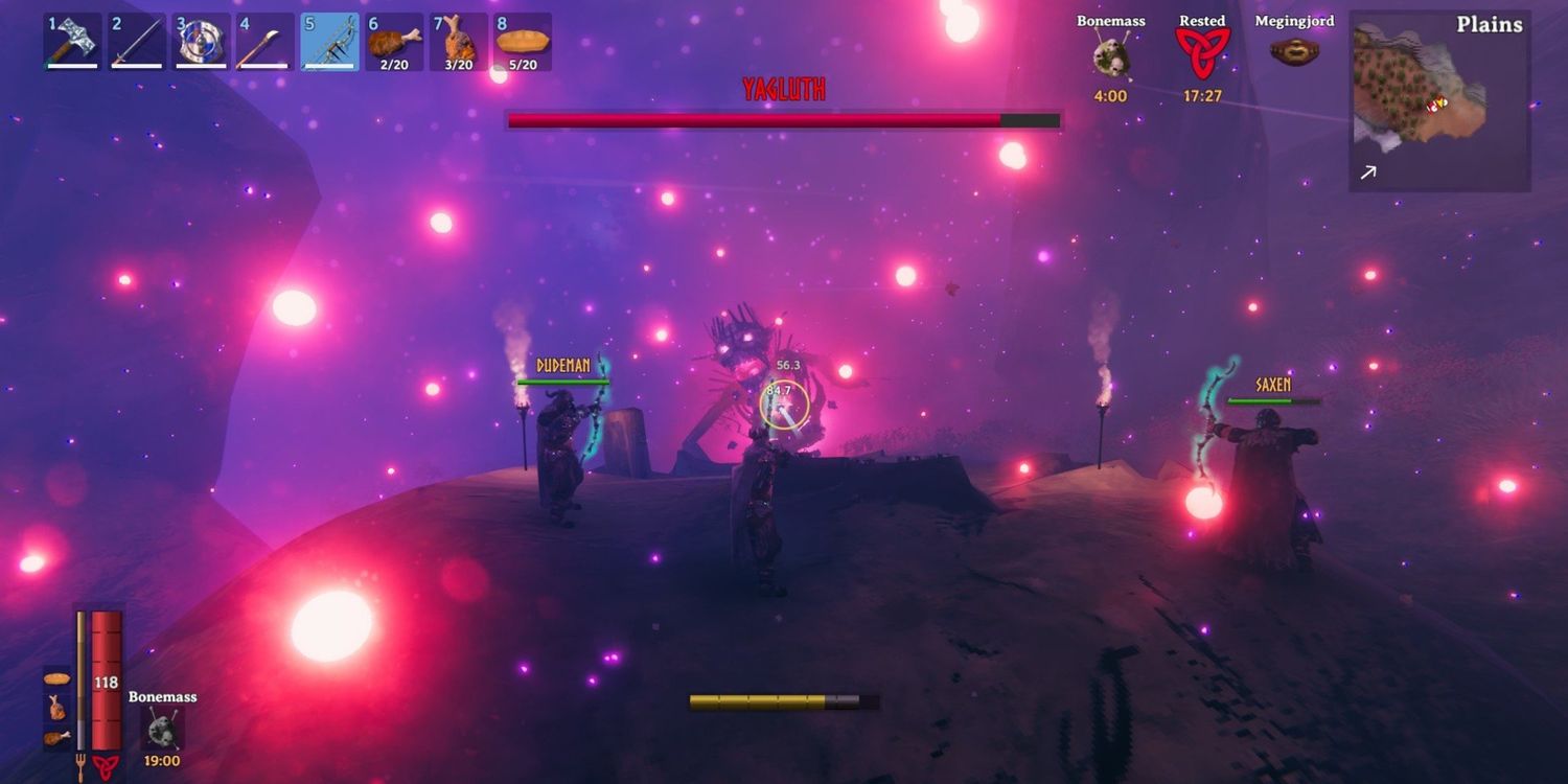 Aparte de simplemente aprender a sobrevivir en los duros biomas de Valheim, los jugadores como vikingos deberán convocar a antiguos enemigos y jefes formidables y derrotarlos para acceder a objetos y poderes únicos. Los jugadores comienzan poco a poco, luchando contra Eikthyr, un ciervo que puede aprovechar el poder del rayo. Las batallas contra los jefes se intensifican drásticamente a partir de ahí. Mientras Valheim está en acceso anticipado, el “jefe final” actual es Yagluth. Yagluth es un esqueleto gigante al que le falta la mitad inferior de su cuerpo. Como el jefe final del juego hasta ahora, es probable que sea el combate más difícil que los jugadores encuentren en el juego.