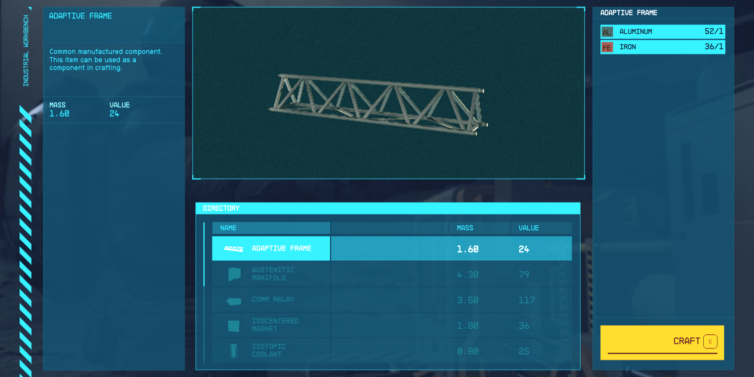 Todo esto también necesitará energía, así que construye paneles solares hasta que tengas suficiente para compensar la diferencia de energía, y luego vete a la cama y cuando te despiertes al día siguiente habrá recursos reunidos. En ese punto, utiliza los recursos adquiridos para construir tantos Marcos adaptables como sea posible utilizando un banco de trabajo industrial. De aquí es de donde vendrá el XP, y los marcos se pueden usar para construir más infraestructura o venderse para obtener más créditos. Si has logrado casarte con un compañero, tu producción de XP aumentará ya que duermes entre cada sesión de elaboración.