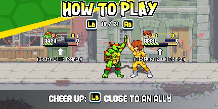 Sin embargo, la acción curativa Cheer Up no es gratuita en TMNT: La venganza de Shredder. Cada vez que los jugadores ejecutan un Cheer Up, el que inicia los cinco altos repondrá el HP de su aliado en dos puntos mientras pierde dos de los suyos en el proceso. En otras palabras, curar a un compañero de equipo es más una transferencia de HP que una “curación gratuita”. Aún así, es un método conveniente y efectivo para ayudar a los aliados a salir de un aprieto o prepararse para el próximo encuentro de combate.