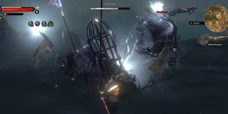 La batalla del jefe de Cloud Giant en el DLC Blood and Wine tiene lugar en una arena envuelta en una niebla turbia pero tormentosa. Cuando comience la pelea, el gigante se sumergirá en la niebla y emergerá con un ataque sorpresa. Geralt necesitará ser ingenioso y esquivar rápidamente cada vez que el jefe salte desde abajo. El Cloud Giant tiene varios patrones de ataque que van desde ataques de barrido hasta golpes contundentes. Si los jugadores tienen dificultades para reconocer qué golpe está a punto de ejecutar el gigante, el mejor curso de acción es esquivar o rodar hacia la derecha.