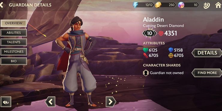 - Suelta un cristal en el portal para obtener un personaje aleatorio. Esta es la forma principal de desbloquear nuevos personajes, aunque no hay una garantía segura de que los jugadores obtengan Aladdin o el personaje que desean en el primer intento. En el menú principal, haz clic en Cristales para ver qué personajes aparecen. Busque la opción que tiene a Aladdin en el grupo de premios destacados y use un Famed Crystal para obtener uno de esos Guardianes. Los cristales famosos se pueden comprar por orbes. Si los jugadores quieren ganar orbes sin gastar dinero real, completa misiones en el juego.