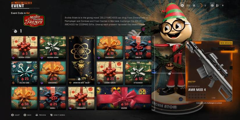 En total, hay 12 recompensas envueltas para regalo que tendrás que desbloquear. Una vez que desbloquees las 12 recompensas, también desbloquearás el nuevo rifle de francotirador AMR Mod 4 como recompensa de maestría.