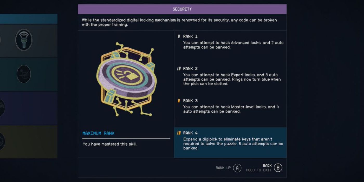 En el rango completo, la habilidad de seguridad permitirá a los jugadores gastar un Digipick adicional para eliminar algunas de las opciones en el minijuego de abrir cerraduras. Esta simple adición es invaluable al abrir cerraduras maestras y ahorrará mucho tiempo y ganzúas a largo plazo.