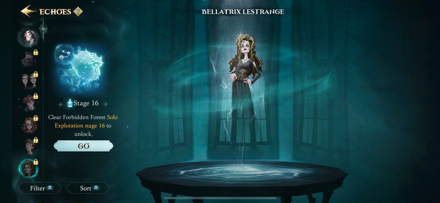 | Bellatrix Lestrange | Completa la etapa 16 de exploración en solitario del Bosque Prohibido. |