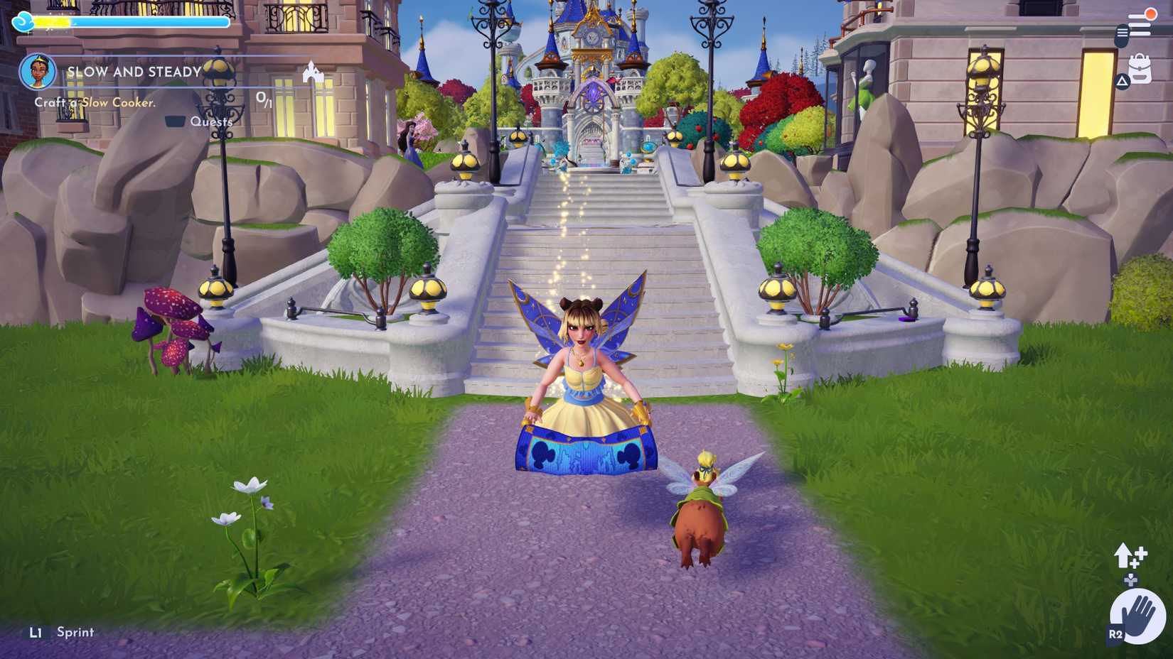 Mientras lo sostiene, el planeador aparecerá, y podrá moverse rápidamente por todo el área hasta que la barra amarilla drene. Si bien las alas permanecerán en tu personaje incluso si no puedes usar la función de planeador, otros planeadores, incluida la alfombra mágica de Dreamlight, desaparecerán a pesar de que todavía están equipados si no tienes la energía para usarlos. Además, puede tomar una foto con la alfombra Dreamlight, de la misma manera que puede con el compañero de alfombra mágica de Aladdin, seleccionando la pose del planeador en las opciones de la cámara en Disney Dreamlight Valley.