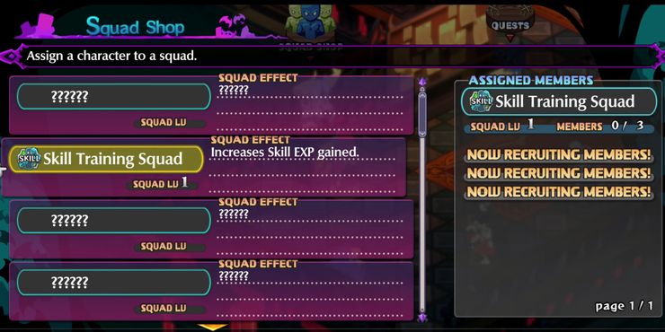 La tienda del escuadrón en Disgaea 6 también ofrece un árbol de actualización lineal que permite a los jugadores mejorar aún más los efectos de escuadrón aplicados a sus aliados. Al gastar EXP almacenada o en la barra de jugos, los fanáticos de JRPG pueden subir de nivel sus efectos de escuadrón. Por ejemplo, el Escuadrón de entrenamiento de habilidades, que aumenta la ganancia de EXP de habilidades, es una excelente opción para nivelar las habilidades de los personajes. El jugador puede usar su EXP almacenada para clasificar el efecto de escuadrón al siguiente nivel, proporcionando bonificaciones como una mayor ganancia de EXP de habilidad y espacios de escuadrón adicionales.