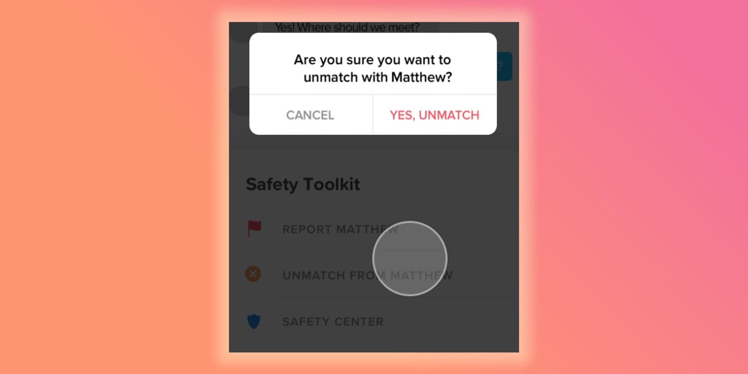 “/> Después de tocar el ‘Inigualable’ , una ventana emergente le pedirá al usuario que confirme la decisión. Los usuarios deben saber que no se notificará a la otra persona que no han sido emparejados. En cambio, ambos usuarios simplemente desaparecerán de la lista de coincidencias del otro y ya no podrán comunicarse entre sí en la aplicación. Sin embargo, esto no se puede deshacer: una vez que desaparecen, desaparecen.
