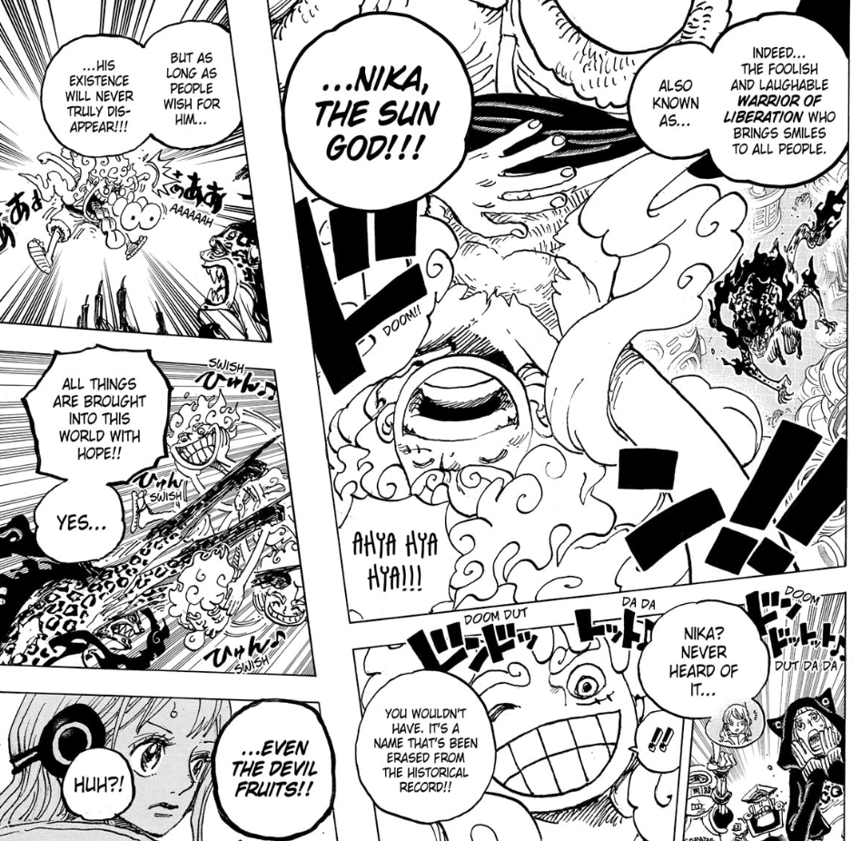 Estas llamas negras también se vieron más tarde en San Saturno y el resto de los Cinco Ancianos cuando revelaron sus formas monstruosas al llegar a Egghead. El Gear Fifth de Luffy también tiene volutas de humo similares enrollándose alrededor de sus hombros, pero son blancas. y no parezcan llamas. Junto con las habilidades únicas de su despertar, que son más parecidas a los tipos Paramecia que a Zoan, esto confirma que la forma de fruta del diablo despierta de Luffy es absolutamente única en la serie.