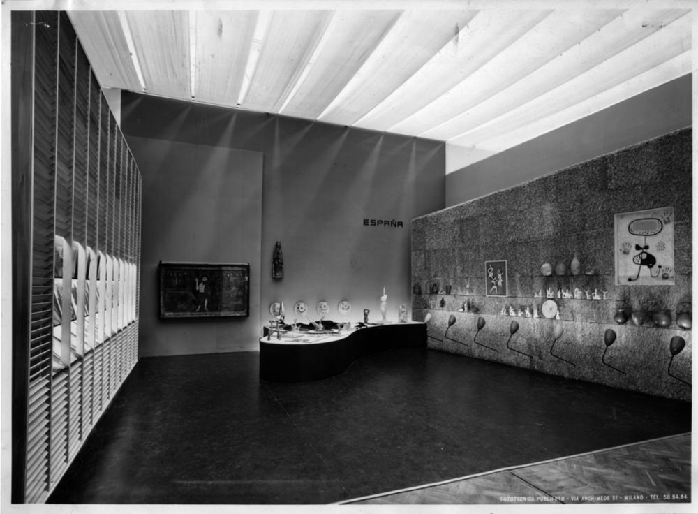 El premio gordo para los organizadores era Joan Miró. El artista había vuelto a España en 1940, viviendo en lo que se ha llamado “el exilio interior” y, según el historiador, las autoridades franquistas no perdían la esperanza de utilizarlo en su beneficio, mostrándolo como una especie de agente neutral aunque no lo fuese. Cuando Coderch y Santos Torroella le solicitaron una pieza para el pabellón, el pintor esquivó la petición diciendo que se dirigieran a su galerista, Jules Maeght, que se negó a ceder ningún tipo de obra para un pabellón que había de representar a la España de Franco.
