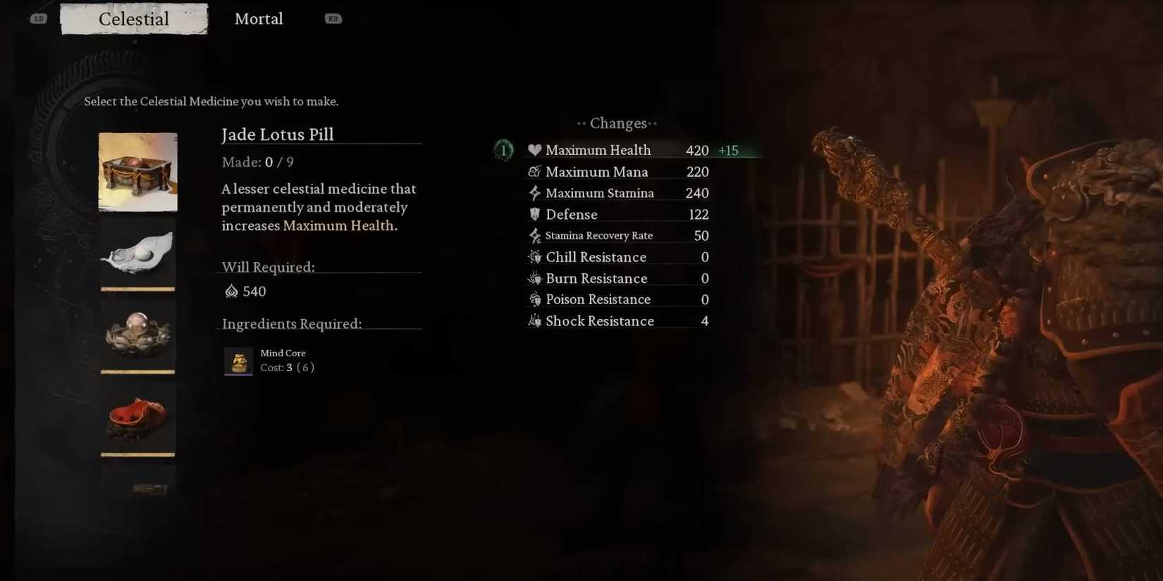 Para hacer una Medicina Celestial para aumentar tus estadísticas base, también necesitas una Píldora de Loto de Jade Celestial para aumentar la salud, una Píldora Taiyi Celestial para mejorar el maná y una Píldora Nonary Celestial para potenciar la resistencia.