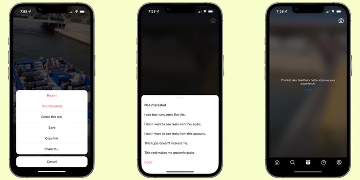 ¡Y eso es! Instagram confirma tu acción con una ventana emergente que dice: “¡Gracias! Tus comentarios ayudan a mejorar tu experiencia”. Puede tocar el botón azul “Deshacer” para revertir su decisión o seguir desplazándose por otros Reels para dejar su eliminación como está. Eliminar un Reel sugerido no solo elimina ese Reel específico que no te gusta, sino que también ayuda a Instagram a recomendar menos videos como ese. Cuanto más elimine los Reels sugeridos que no son de su agrado, mejor Instagram debe llegar a recomendar carretes sugeridos que le gusten ver.