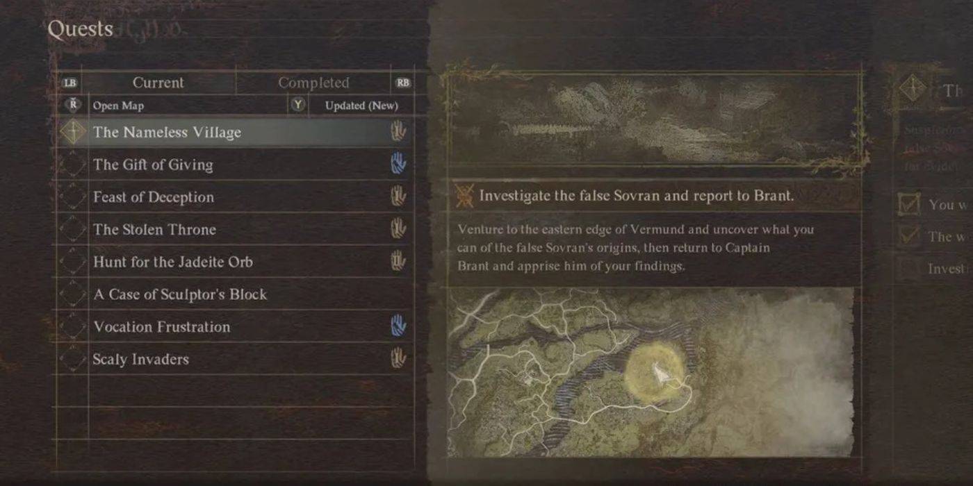 En las primeras etapas de Dogma del Dragón 2En la misión principal, encontrarás pistas sobre el misterioso Falso Sovran de un pueblo apartado ubicado en el extremo noreste de Vernworth. Esto lleva a descubrir la historia de fondo de un antagonista clave que se hace pasar por ti. Desentrañar el misterio de este robo de identidad implica descubrir complejos acertijos que el juego oculta sutilmente, ofreciendo una guía mínima sobre cómo proceder con la búsqueda.