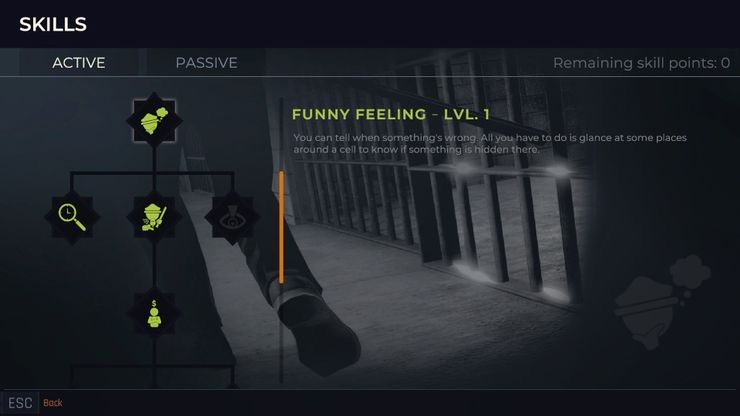 Los jugadores comienzan como guardias novatos en Simulador de prisión, pero puede adquirir nuevas habilidades hablando con Alexander Davis dentro de Sala de guardia. Uno deberá alcanzar ciertos niveles de personaje para requisitos mínimos, puntos de habilidad y fondos personales. Los jugadores querrán adquirir varias habilidades del árbol activo: Confianza, Sensación divertida, Buscando e intimidandoy cualquier requisito previo. La primera habilidad, Confianza, permite a los jugadores intercambiar bienes directamente de los reclusos, quienes pueden vender galletas a varios precios. Funny Feeling resaltará varios objetos, ya sea en verde como artículos seguros o en rojo para el contrabando ilegal: los jugadores deben tomar cualquier artículo ilegal para sí mismos, pero devolvérselo a los prisioneros que piden el artículo para obtener una calificación de respeto adicional. Finalmente, Search and Intimidating hace que todas las búsquedas sean más rápidas y brinda una mayor probabilidad de que un recluso escuche sus órdenes.