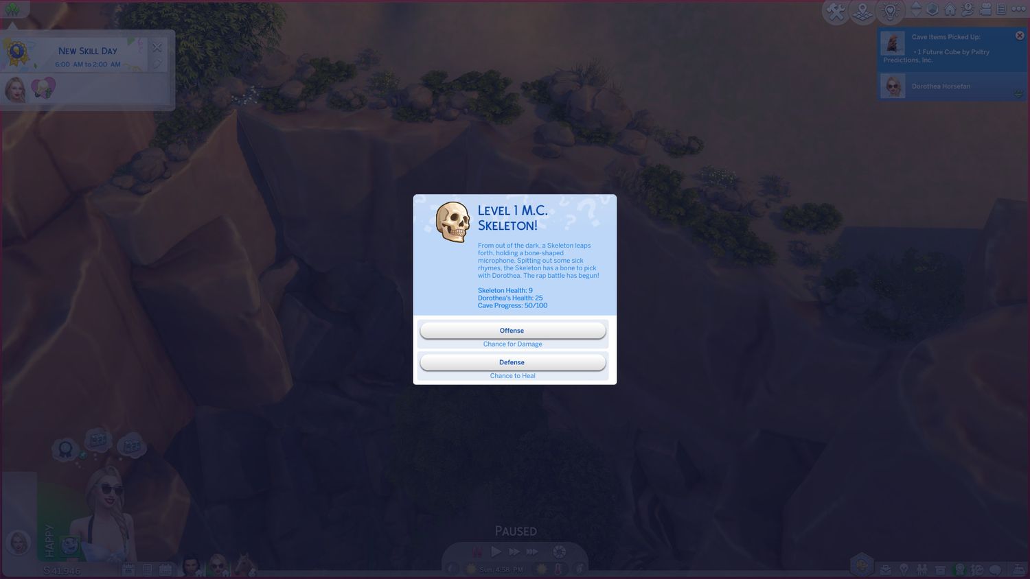 Tanto los enemigos como los Sims tienen una cantidad determinada de salud, y los Sims pueden encontrar ciertos eventos que los expulsarán de la cueva por el día o acertijos para los cuales necesitarán traer elementos especiales para completar.