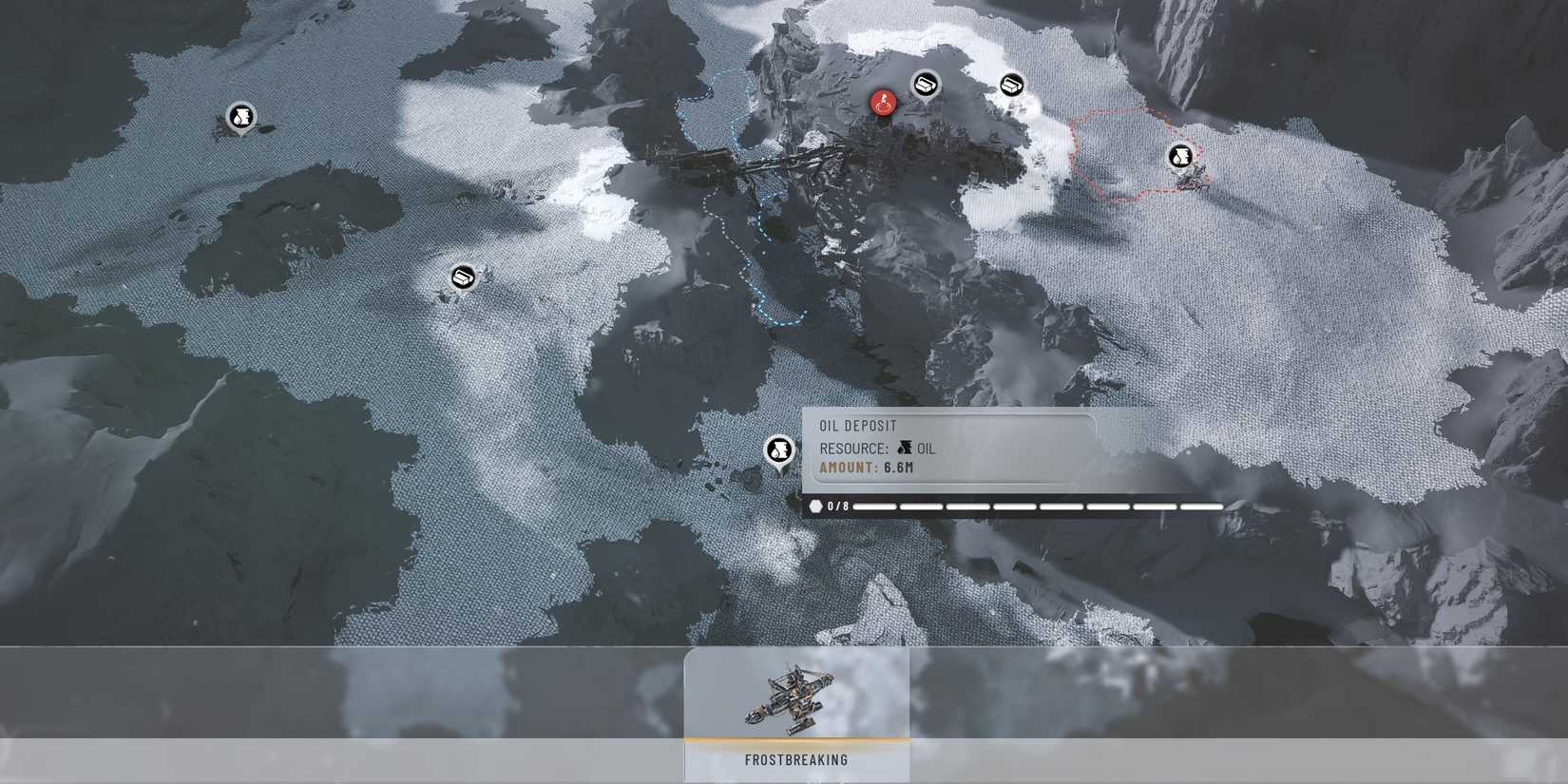 Si bien el carbón era la principal fuente de combustible en el siglo XIX, Frostpunk, Frostpunk 2 El camino toma una dirección diferente cuando tus reservas de carbón comienzan a escasear, lo que te obliga a buscar una fuente de combustible más permanente: el petróleo. Podrías pensar que este es uno de los nodos de recursos cercanos que rodean New London, pero después de un escaneo rápido, verás que no es así. Para encontrar petróleo habrá que ir un poco más lejos. El sistema de exploración es el mismo que en el juego original, a diferencia de algunos de los nuevos sistemas introducidos..