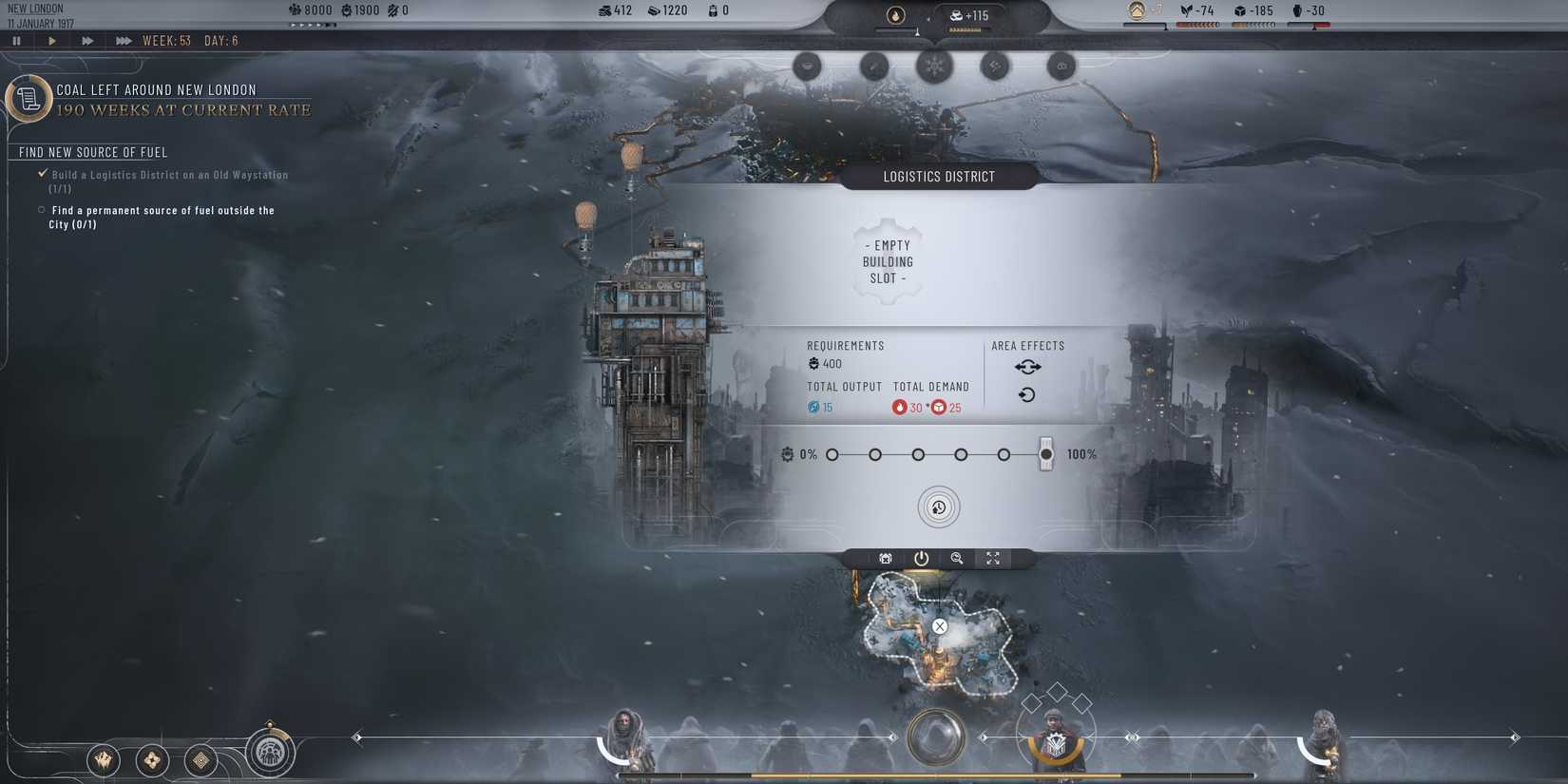 Las reservas de petróleo son mucho más profundas que las de carbón, por lo que durarán más que los depósitos de carbón poco profundos en el paisaje de New London. Son una fuente de energía bastante constante, especialmente si tienes las mejoras adecuadas para tus distritos de extracción. A menos que aceleres tu investigación, es probable que necesites petróleo antes de poder investigar demasiado. Esto significa que no solo tendrás que encontrar una fuente de petróleo, sino que también tendrás que poder extraer suficiente para mantener a tu gente abrigada, y eso requerirá algo de investigación de edificios. Para comenzar, construye un centro logístico y explora Frostland.