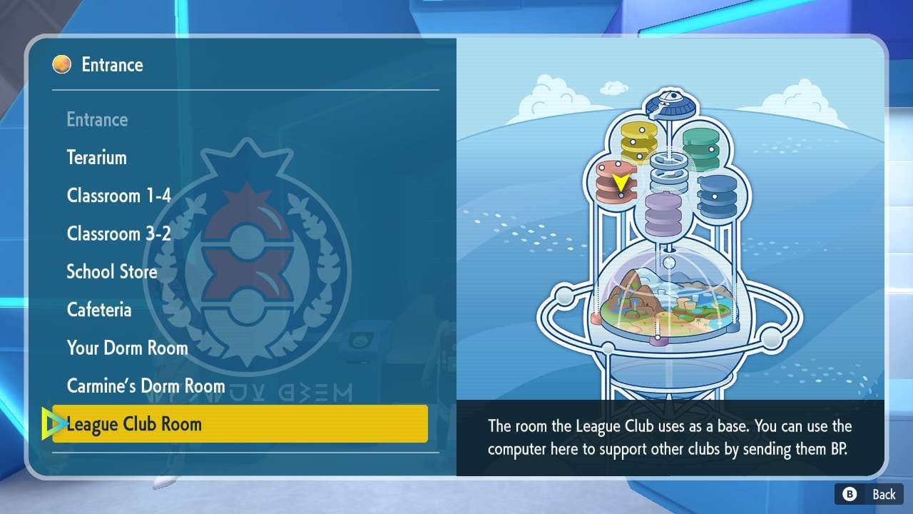 “/> Después de que los jugadores hayan sido presentados al Club de liga En Blueberry Academy, Drayton también presentará la computadora en la sala del club. Aquí es donde los jugadores pueden gastar los BP que se obtienen en el terrario. Para desbloquear los principiantes, los jugadores deberán actualizar cada bioma individualmente en 3.000 AP cada uno o 12.000 AP. BP se puede obtener terminando barbacoas o luchando. Para barbacoas, presione el botón D-pad derecho para abrir el registro de misiones y ver las tres tareas disponibles. Una vez completado uno, otro lo reemplazará.