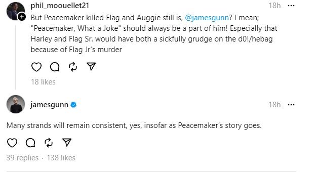 Finalmente, phil_moouellet21 declaró: “¿Pero Peacemaker mató a Flag y Auggie todavía lo es, @jamesgunn? Quiero decir: “¡Peacemaker, What a Joke” siempre debería ser parte de él! ¡Especialmente porque Harley y Flag Sr. tendrían un rencor enfermizo contra d0!/hebag por el asesinato de Flag Jr.” a lo que Gunn dijo, “Muchas corrientes seguirán siendo consistentes, sí, en lo que respecta a la historia de Peacemaker”.