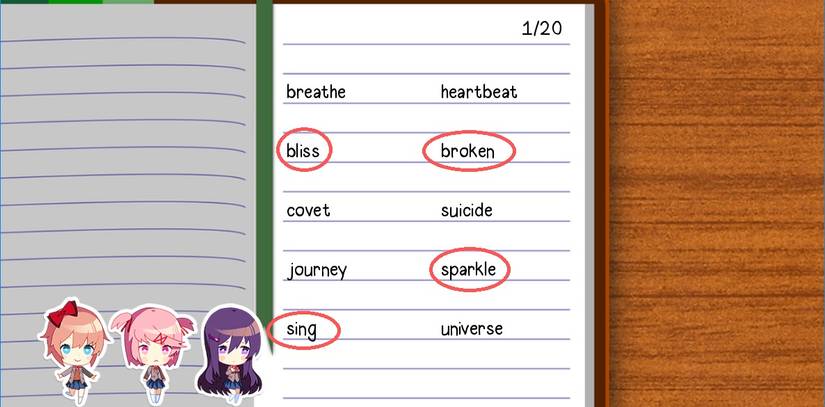 Mientras escriben poemas, muchas chicas tienen palabras favoritas superpuestas, así que asegúrese de ceñirse a la lista de su elección deseada; de lo contrario, podrías conquistar accidentalmente a otra chica. o incluso escribir un poema neutral en Club de literatura Doki Doki Plus.