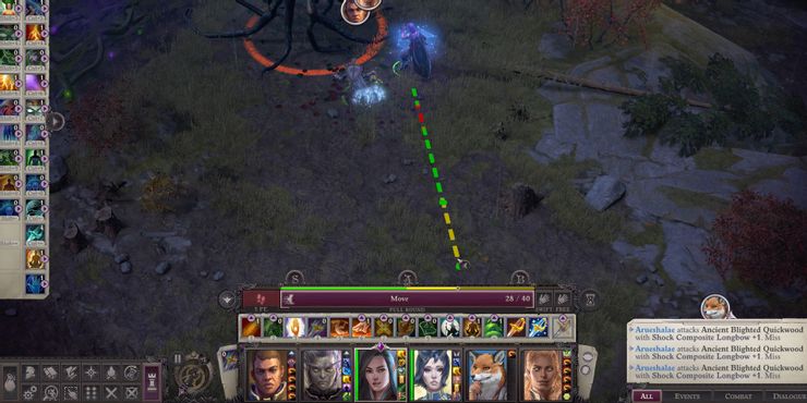 • Movimiento: Cuando un personaje abandona activamente (pero no entra) en un rango de amenaza, se activará un AoO, resaltado como una línea punteada roja. Esto también incluye ponerse de pie desde una posición boca abajo. Una excepción es dar un paso de cinco pies, que es una palanca separada durante el modo por turnos.