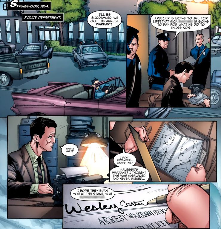 En Freddy vs.Jason vs.Ash: The Nightmare Warriors # 6, Krueger se niega a aceptar la derrota a pesar de que su ejército ha sido aniquilado, Jason aparentemente asesinado para siempre y otro vórtice provocado por el Necronomicon. Al igual que los Dream Demons en Freddy’s muerto, el libro infernal lo considera indigno y le quita su poder. Sin ninguna protección, las súplicas de piedad del humano, de nuevo Freddy, no se escuchan cuando Ash le dispara, su cuerpo cayendo a través del vórtice. Pero la verdadera sorpresa llega al final, cuando un agente Wesley Carter, desplazado en el tiempo e inconsciente, se encuentra en el departamento de policía de Springwood el día exacto en que Freddy Krueger fue arrestado en 1964. A pesar de su desorientación, se encuentra con los documentos relacionados con el arresto de Krueger. y los firma, sin saberlo, alterando la historia en el proceso.