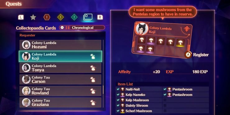 Lo que hace que las cartas de Collectopaedia sean únicas en comparación con las misiones de búsqueda de otros juegos es que los jugadores no necesitan volver a la persona que les dio la misión. Xenoblade crónicas 3 para recibir las recompensas. Una vez que los jugadores obtengan una tarjeta Collectopaedia, busque en el menú Quest para encontrarla. Las tarjetas Collectopaedia están organizadas en varias categorías según los tipos de solicitudes; Es posible que los jugadores necesiten encontrar flores, madera, gemas raras, comida o incluso matar enemigos. Por lo general, el elemento solicitado se puede encontrar en la misma región que el NPC, por lo que los jugadores no necesitarán buscar demasiado para completar la misión de la tarjeta Collectopaedia.