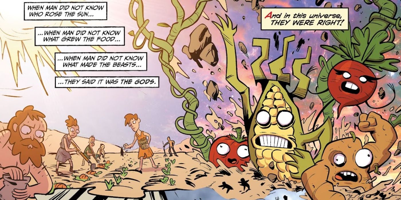 “/> explicado en Rick y Morty #9 Por Alex Firer y Fred C. Stresing, esta nueva información relacionada con los dioses se revela en una página de presentación que representa a varios dioses y los humanos que les han dado vida. Al decirle a los lectores: “Cuando el hombre no sabía quién hacía salir el sol… cuando el hombre no sabía quién cultivaba los alimentos… cuando el hombre no sabía qué hacía las bestias… decían que eran los dioses”, la narración continúa diciendo: “Porque en cada impulso antiguo… cada necesidad… cada dolor… los dioses estaban ahí”. Luego se revela que “… los mortales se sintieron resentidos por el poder que los dioses les habían otorgado”. es aquí donde se confirma quién otorga su poder a estas entidades: los humanos.