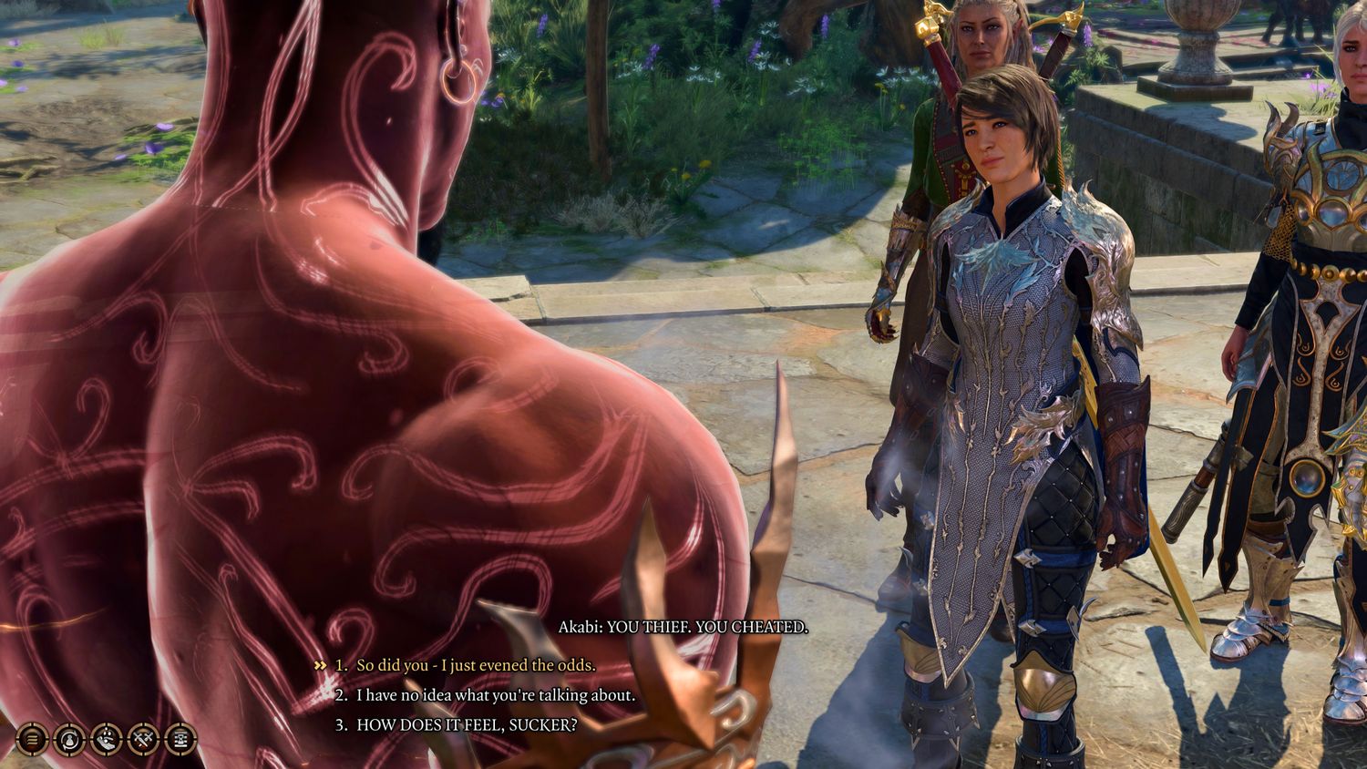 Desafortunadamente, Akabi se dará cuenta inmediatamente de que lo has engañado. Puedes responder como quieras a su acusación, pero independientemente de la opción que elijas, él teletransportará a tu personaje a un lugar lejano. Selva en Chult. Los jugadores pueden resolver bastantes conflictos con Charisma, pero este no es uno de ellos.