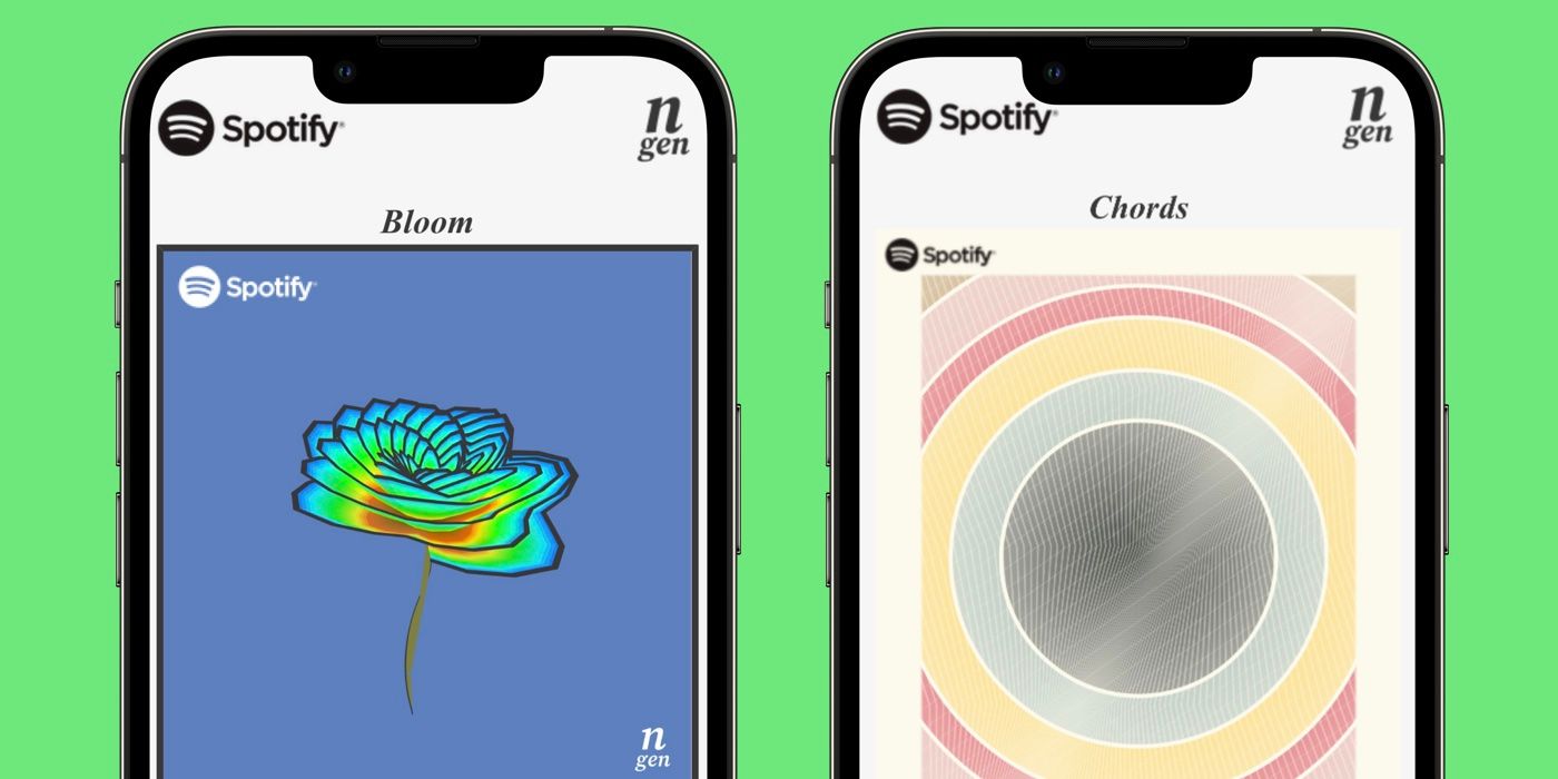 Si eligen el estilo artístico de Acordes, los usuarios verán su historial de escucha como “un diseño colorido similar a la pana.” Las imágenes creadas tienen colores, formas y patrones cambiantes. Los usuarios pueden elegir entre varios períodos de tiempo para generar su obra de arte y, al igual que la opción Bloom, guardar la imagen como fondo de pantalla. Cada obra de arte generada en N-gen brinda a los usuarios un desglose de ellos Spotify estadísticas y, en el caso de los estilos Bloom y Chords, una explicación del arte específico creado.