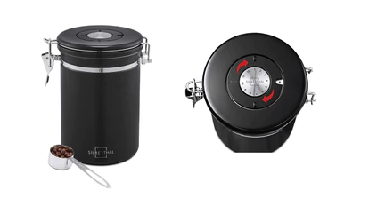 Fabricado en acero inoxidable, este recipiente está diseñado especialmente para almacenar café molido o en polvo. La tapa, con cierre hermético, incluye también un calendario para anotar la fecha en la que se ha guardado. Además, la válvula de la tapa permite mantener el aroma durante más tiempo. Se acompaña de una cuchara para coger el café, sus dimensiones son 13 x 19 x 17 centímetros, y tiene una capacidad para 500 gramos.
