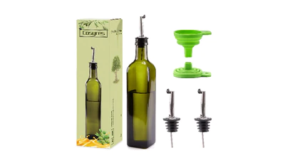 Una botella que sirve tanto para almacenar como para servir el aceite, con un diseño sobrio y sencillo para adaptarse a distintos entornos. Está equipada con un dispositivo para verterlo fácilmente y de forma controlada, evitando así derrames o goteos indeseados. Además, se acompaña de un pequeño embudo y las tapas se presionan suavemente con la mano para abrirlas y cerrarlas. El color verde del vidrio ayuda a proteger el aceite de la luz solar para evitar su oxidación y deterioro.