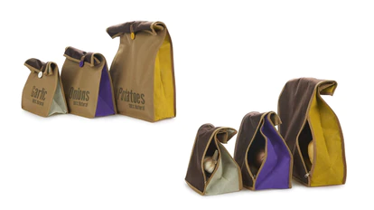 Esta propuesta presenta tres bolsas de distinto tamaño para conservar los alimentos en buen estado durante más tiempo. Están confeccionadas en tela y disponen de una cremallera lateral para introducir o sacar ajos o cebollas cómodamente. Su diseño permite la transpiración de los alimentos para evitar, así, posibles malos olores en la cocina.
