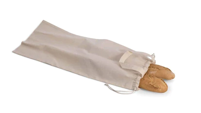 Confeccionada en algodón orgánico, esta bolsa con capacidad para guardar dos o tres barras de pan es perfecta para almacenarlo correctamente y, además, tiene un diseño sencillo y versátil para colocarla sin problema en cualquier cocina. Dispone de asas y un cierre con cordón. Sus medidas son 70 x 29 centímetros.