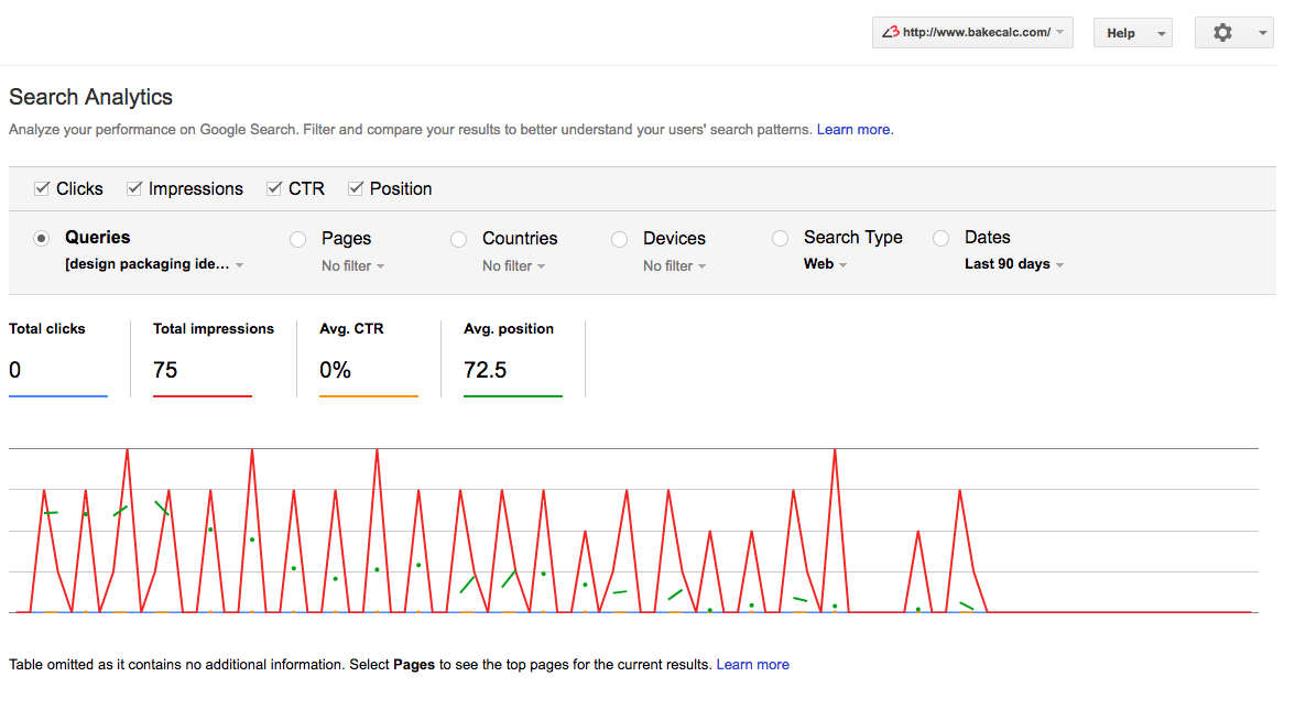 Por ejemplo, a continuación se muestra una captura de pantalla de la (antigua) interfaz de las Herramientas para webmasters de Google. Visualiza este proceso de evaluación de la calidad: muestra una publicación de blog con el potencial para clasificar la palabra clave “ideas de diseño de empaque”. Google inicialmente la clasificó en la posición 25.