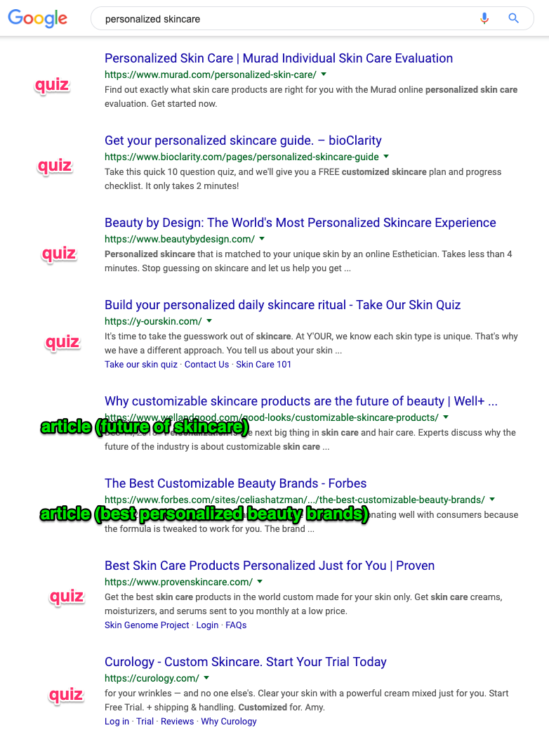 Por lo tanto, si no realiza una verificación como esta antes de escribir un artículo sobre “cuidado de la piel personalizado”, es muy probable que esté perdiendo el tiempo. Porque, para algunas consultas, Google ha comenzado a priorizar las recomendaciones locales, videos, pruebas u otros tipos de resultados que no son artículos.