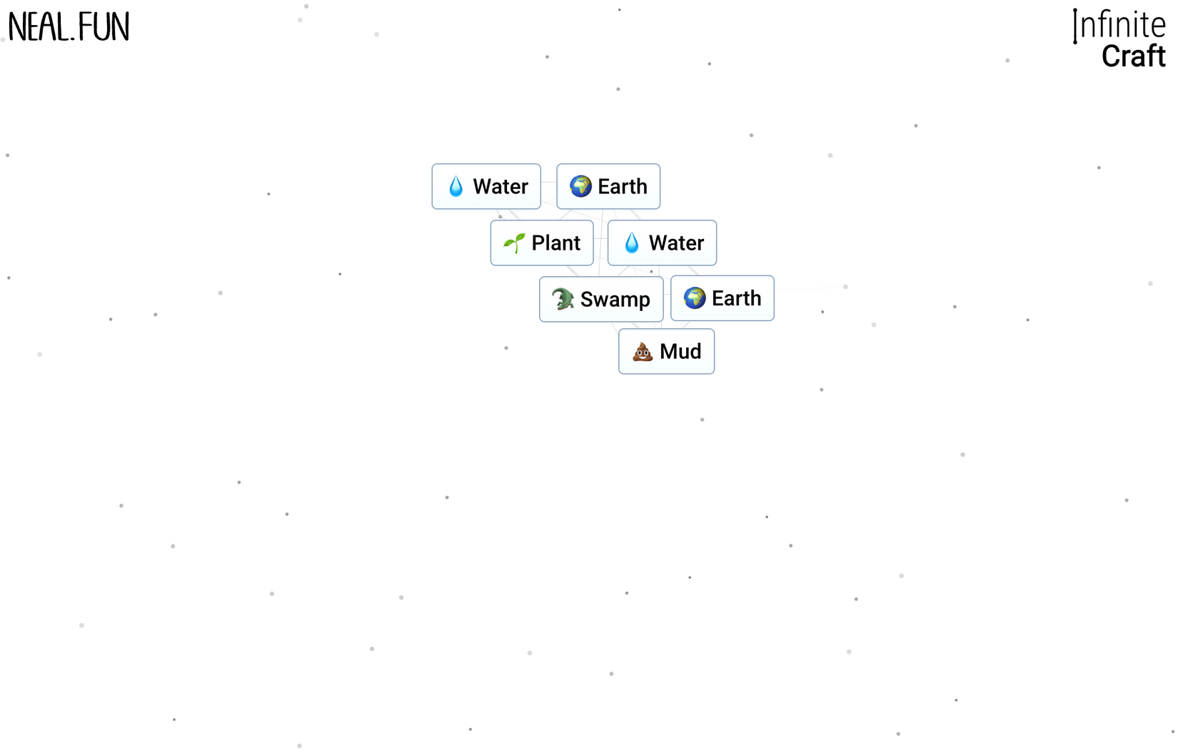 Una vez que haya producido el resultado Planta, querrá volver a uno de sus elementos base y combinar Planta con Agua. Esto te dará el resultado de Pantano, que combinarás con Tierra para producir Barro.