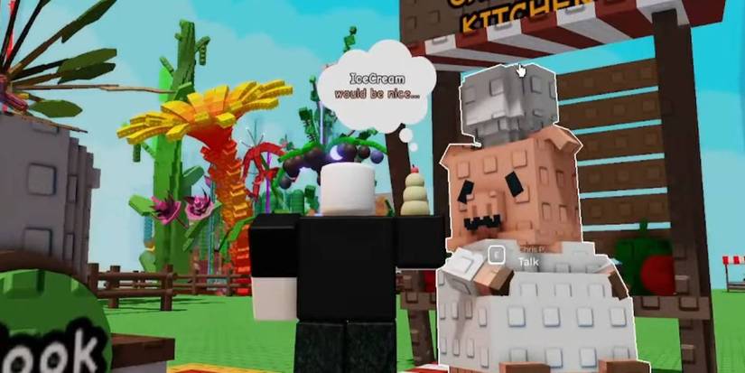 Una vez que tenga todos los ingredientes correctos, puede obtener helado elaborándolo como cualquier otro alimento en este popular RaBlox título. Cuando estés listo, ve a la mitad del Cultivar un jardín mundo donde está el chef de cerdo con sus ingredientes para comenzar.