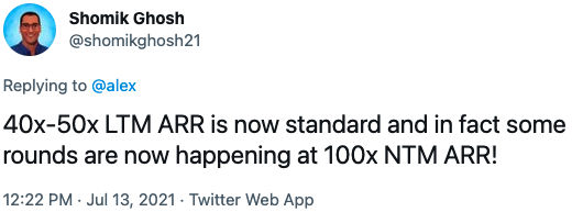 Eso es lo que significa NTM: próximos 12 meses. La declaración de Ghosh indica que algunas startups en realidad pueden recaudar capital a múltiplos aún más altos de sus ingresos actuales, disfrutando de precios que pueden llegar a 100 veces su ARR por el próximo año.