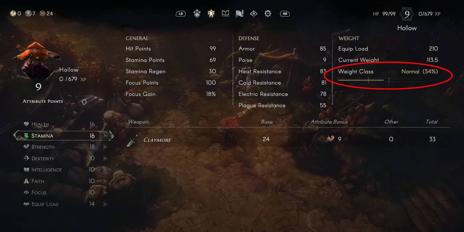 La categoría de peso afecta principalmente tu velocidad de sprint y tu capacidad de esquivar. En las categorías de peso más pesado, tus movimientos de esquiva son más lentos. Esto no importará demasiado, dado que Tus primeras líneas de defensa son los bloqueos y las paradas. Es importante dominar las paradas, en particular, para que esta construcción funcione. Dado que las mazas pueden causar menos daño que las armas grandes de dos manos, debes crear ventanas de oportunidad tú mismo haciendo tambalear a tus oponentes.