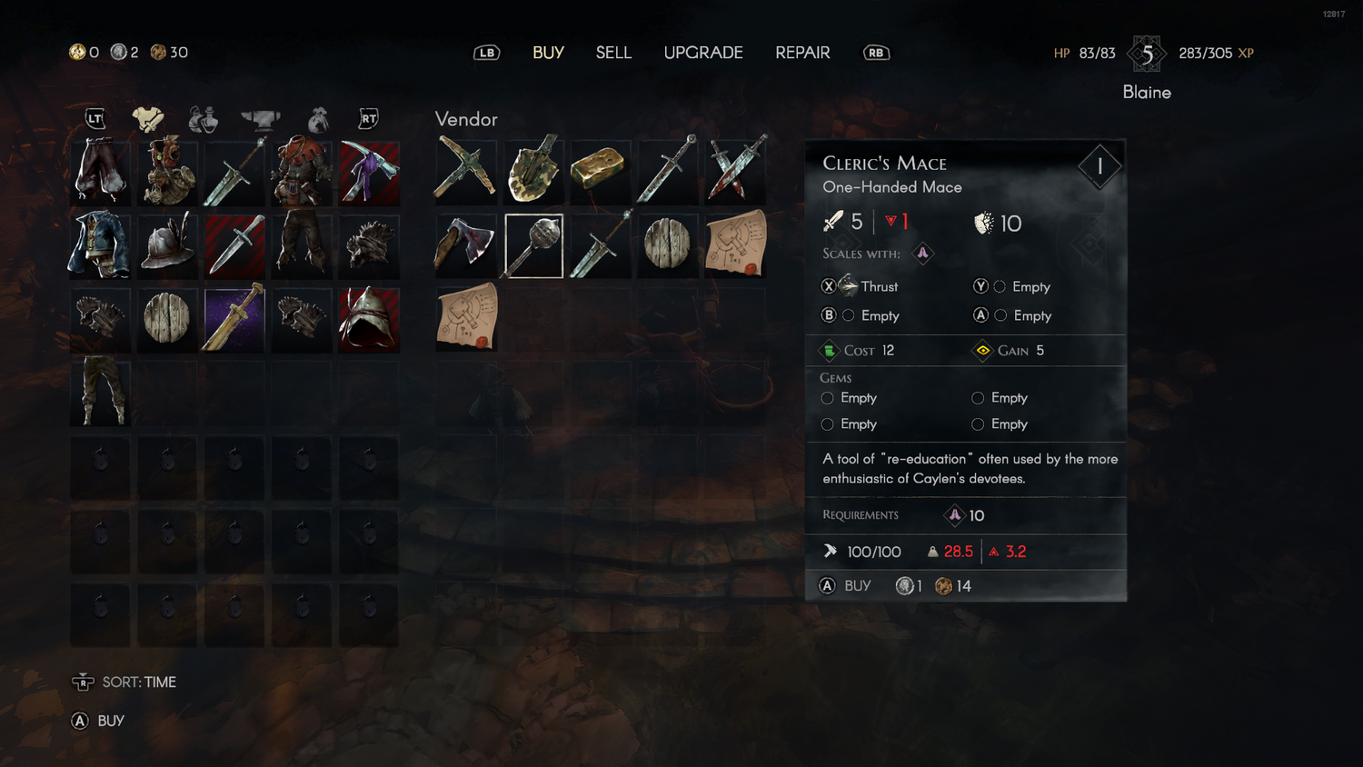 Subir de nivel te da tres puntos para gastar en la estadística deseada, por lo que aumentar tu fe puede llevar algún tiempo. No te desanimes si no puedes equipar inmediatamente el martillo y los escudos que encuentras en Sacra, ya que esta construcción requiere mucho más tiempo de preparación que las cargas de fuerza o destreza más sencillas.