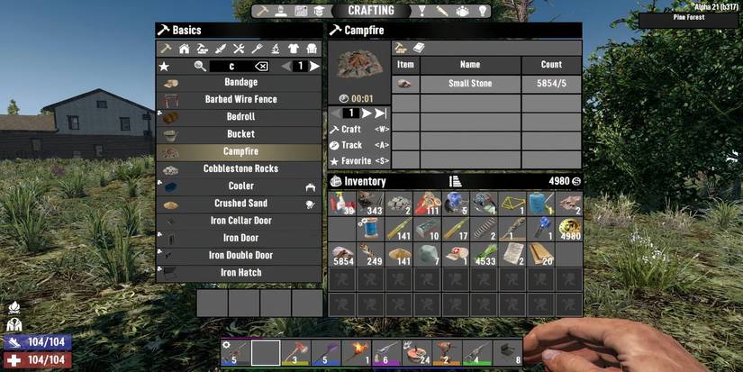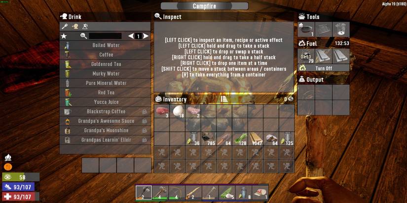 Una vez que se hayan reunido todas las herramientas e ingredientes, Es hora de empezar a hervir el agua turbia. Primero, Enciende la fogata con el combustible. Combina el agua turbia con la olla de cocina en tu inventario arrastrando la olla de cocina al Pestaña de herramientasHaz clic en el agua turbia y luego en Fabricar. Agrega la olla a la fogata. Una vez que el agua esté purificada, será segura para beber, lo que proporcionará +20 de hidratación y +15 % de regeneración de resistencia.