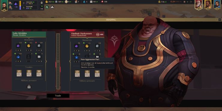 El último tipo de tratado que los jugadores pueden hacer en Dune: guerras de las especias es un pacto de no agresión. Con esto, las unidades ya no pierden el suministro cuando se encuentran en el territorio del otro signatario. Algo bueno, considerando el duro desierto. Este tratado requiere que los jugadores hayan desbloqueado el desarrollo Maniobras diplomáticas. Está justo debajo del desarrollo de Intelligence Network, por lo que al menos no tardará mucho en desbloquearlo. Alternativamente, si los jugadores eligen House Atreides como su facción, pueden elegir a Lady Jessica como una de sus consejeras. Una de sus habilidades es que los jugadores comienzan el juego con el pacto de no agresión desbloqueado. Es excelente para aquellos que desean evitar los conflictos tanto como sea posible, pero es una forma desafiante de jugar.