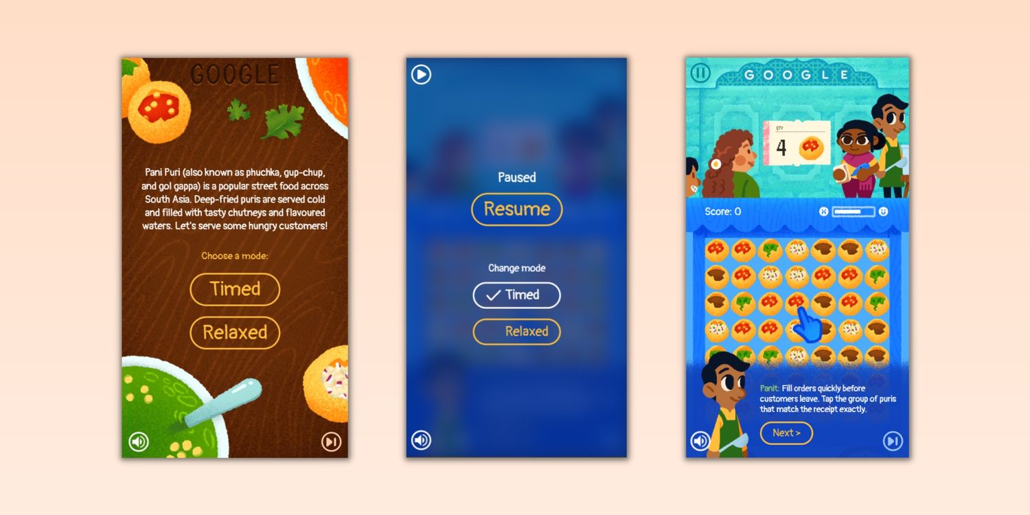 Pani Puri Google Doodle es un videojuego tipo rompecabezas en el que los jugadores deben tocar ciertos elementos para obtener puntos.. En algunos casos, deben coincidir con una serie de ellos, como en Candy Crush. Sin embargo, en lugar de hacer estallar caramelos, los jugadores hacen estallar pani puri. un snack elaborado con un pan plano frito y hueco por dentro, relleno de agua aromatizada, garbanzos y diferentes salsas. Es popular en los países del sur de Asia, especialmente en el subcontinente de la India. En el juego de doodles de Google, se supone que los jugadores deben preparar bocadillos para los clientes combinando y haciendo estallar pani puris. con la misma apariencia.